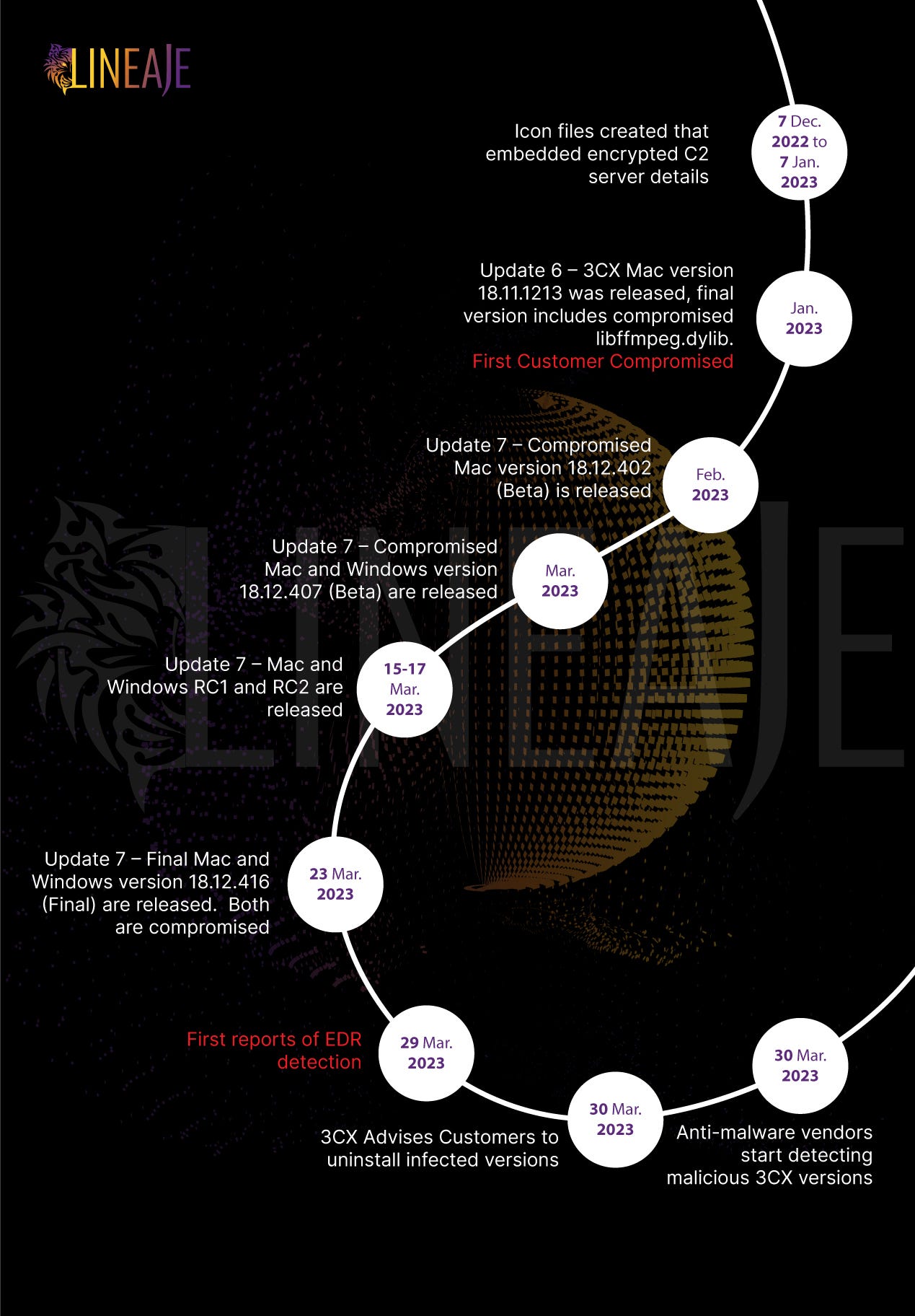 The table below lays out a chronology of 3CX attack timeline. Effectively, the best estimate available is that the effort to compromise started Dec 7, 2022. The first infection was in January 2023 and the first detection was on March 29, 2023.